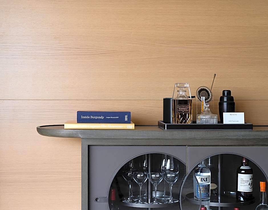 This large wrap-around corner suite has a separate living room and bedroom with panoramic views of Victoria Harbor. The living room features a harbourview bar counter and powder room. The oasis bathroom offers an immersive experience with a round windowfront bath for two with harbourviews and a separate immersive shower and double sinks.