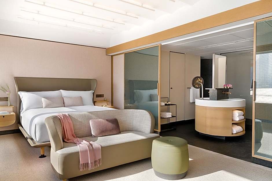 A spacious suite with beautiful sea and sunrise views facing the eastern part of Victoria Harbor and Hong Kong Island. The large open room layout includes a personal haven with a windowfront daybed. The oasis bathroom features an immersive bath, separate shower and double sinks.
