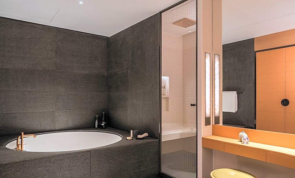 A spacious suite with breathtaking views of Victoria Harbor and the Hong Kong Island skyline. The generous open room layout includes a personal haven. The oasis bathroom features an immersive bath, separate shower and double sinks.