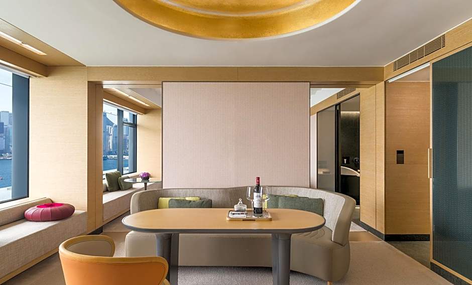 A spacious suite with breathtaking views of Victoria Harbor and the Hong Kong Island skyline. The generous open room layout includes a personal haven. The oasis bathroom features an immersive bath, separate shower and double sinks.
